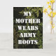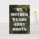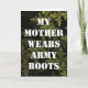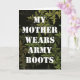 A Mother's Day card for a military mom. Features a brown and green fractal leaf/needle pattern camouflage suitable for either coniferous or deciduous forests. Customizable text on teh cove reads "MY MOTHER WEARS ARMY BOOTS." Customizable text inside reads "HAPPY MOTHER'S DAY!"