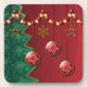 Layers of fractals make up this stylized Christmas design. A muted red backdrop, a spiky green tree, gold stars and snowflakes hanging from a strand of red and gold beads, and three red balls with a twirling gold design hanging in front.