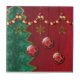Layers of fractals make up this stylized Christmas design. A muted red backdrop, a spiky green tree, gold stars and snowflakes hanging from a strand of red and gold beads, and three red balls with a twirling gold design hanging in front.