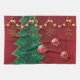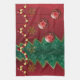 Layers of fractals make up this stylized Christmas design. A muted red backdrop, a spiky green tree, gold stars and snowflakes hanging from a strand of red and gold beads, and three red balls with a twirling gold design hanging in front.