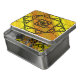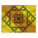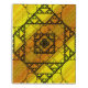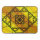 Three styles of hand-drawn fractals, including Sierpinski triangles, Apollonian gaskets, and a similarly themed square design, make up the layers of this geometric mandala, overlaid onto a bright yellow and orange gradient.