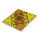 Three styles of hand-drawn fractals, including Siepinski triangles, Apollonian gaskets, and a similarly themed square design, make up the layers of this geometric mandala, overlaid onto a bright yellow and orange gradient. This tile can be framed to create a trivet or placed inside a wooden gift box lid.