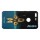 A brown-toned fractal image suggesting a highly-stylized Inuit hunter, wearing traditional fur clothing, holding a harpoon with an ivory head. The image is superimposed on a background depicting the dark polar winter. Text reading "Alaska" also appears in glowing blue and white. Customize by adding your own additional text.