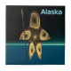 A brown-toned fractal image suggesting a highly-stylized Inuit hunter, wearing traditional fur clothing, holding a harpoon with an ivory head. The image is superimposed on a background depicting the dark polar winter. Text reading "Alaska" appears in glowing blue and white.