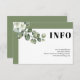 Frame with eucalyptus and white flowers wedding details enclosure card. This elegant wedding design features a white frame and sage green borders. On the upper left corner there a branch of eucalyptus with white flowers while the word 'INFO' is in bold typography. The back is of sage green color with a QR code. Guests can scan it to have more information.