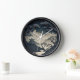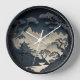 An elegant round wall clock picturing a framed 3D Chinese landscape in shades of grey.