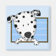 Our cute Dalmatian magnet has the infamous spotted dog drawn as a cartoon! His head is slightly at an angle as he looks out curiously. The frame's background is blue striped. His black and white paws are on the edge of the picture frame. Unique Dalmatian gifts featuring your favorite dog breed. This design is available on other dog lover merchandise too.