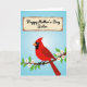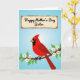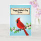 This card shows a striking red bird perched on a brown branch dotted with small white blossoms, each flower marked by a tiny orange center 🌼. The bird’s pointed crest and dark face marking frame a bright orange beak, giving it a confident look that feels like it’s leaning in to share a quiet moment. Around the bird, green leaves curl outward, softening the scene like a gentle embrace ❤️. The background fades through light-to-medium sky blues, like a calm spring day stretching upward. Near the top, a rectangular message area sits centered, outlined with a thin, rustic-looking border in a warm brown tone. Inside that frame, the text is placed in the middle in a flowing handwritten look, colored in a darker shade that stands out against the pale blue. The lower half stays grounded with the bird and blossoms, while the upper half remains open and airy with the framed words and smooth blue gradient.