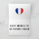 Beautiful design includes happy balloons and ticker tapes with the words "Happy Birthday", all in the colors of the France flag. Design is finished with the heart in the France flag colors and the Birthday message which is completely customizable. This colorful birthday card is the perfect present for your friend from France.