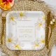 Pretty botanical watercolor frangipani plumeria wedding paper plate featuring an original hand-painted watercolor flower print with a gold graphic frame. Beautiful white floral wedding favors ideal for a botanical or sub-tropical or tropical flower and or beach-themed wedding. Personalize with your own details. Other matching items are also available. © Original floral watercolor hand painting and design by Sarah Trett for www,mylittleeden.com and www.mylittleedenweddings.com