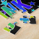 This vibrant, fun, birthday-themed jigsaw puzzle design features the message "HAPPY BIRTHDAY, FRANK" with the characters having a colorful rainbow spectrum inspired gradient pattern, along with a lively field of stars background pattern. A vibrant puzzle like this might be used to send a birthday greeting message to somebody named Frank. [~Z0000468]