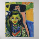 Fränzi in Front of Carved Chair (1910) by German expressionist painter Ernst Ludwig Kirchner is a striking and emotive portrait that explores the use of vivid, non-naturalistic colors. The painting features a young girl, Fränzi, whose green face contrasts boldly with the abstract, colorful background. Surrounding her are elements of a carved chair, adding texture to the composition. Kirchner's innovative use of exaggerated color and form is a hallmark of his expressionist style, conveying deep emotional intensity and highlighting his skill in capturing psychological depth through abstraction.