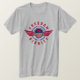 This design features a circular emblem with a patriotic theme. In the center is a shield with the flag of the United States, featuring its typical red and white stripes and a blue rectangle with white stars. The shield is flanked by two stylized red wings, giving a sense of dynamism and freedom.