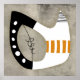 A minimal chunky curved shape abstract in black and white with orange accent. Over a beige mottled background sits a large shape with a cutout. There are white dots, orange and white stripes, along with fine pencil detail to complete the image.