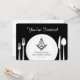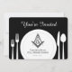 Modern Freemason invitation that will add a touch of elegance to your masonic dinner fellowship event! This custom card can be personalized and works well with the Annual Installation of Officers and other lodge events. This customized card features the square and compass of freemasonry, along with a dinner plate and silverware utensils (fork, knife, spoon). Colors: black and white.