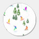 Cool whimsical illustration art of colorful snowboarders, snowboarding downhill in mountains among pine, spruce, fir trees on fresh snow powder. Snowboard and xmas outdoor sport in a winter forest. Snowboarder gifts. Snowboarding Christmas decor.