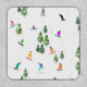 Cool whimsical illustration art of colorful snowboarders, snowboarding downhill in mountains among pine, spruce, fir trees on fresh snow powder. Snowboard and xmas outdoor sport in a winter forest. Snowboarder gifts. Snowboarding Christmas decor.