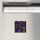 The pattern is of pansies, Darwin fish, atomic symbols, atheist A's and stars. It is colorful and vibrant.