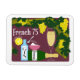 An elegant Art Deco image of vines and grapes surrounds the ingredients for a French 75. Champagne, sugar, gin, and lemon--so simple, yet so ooh la la!
