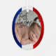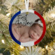 This cute custom ornament features a French Christmas theme. A sample baby photo is placed in the center which you can personalize to include your baby's own custom photo or other picture of your choice. The title "First Christmas" is printed to the left in an elegant script font, followed by a sample year. The border features a blue, white, and red texture design to resemble the flag of France.