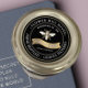 Black Label with Vintage French Bee features a double white border circling your Apiary Name and Location. Apiary name is displayed in curved text across the top and the beekeeper's city and town are written in curved text underneath apiary name. There is a delicate white and taupe border near the outer perimeter of the label. The words “PURE RAW HONEY" are written on a wavy gold gradient banner in center of label (and may be deleted & substituted for the word “HONEY" by “unhiding” the eyeball icon on the left of the word HONEY on line 1 in DESIGN PANEL)