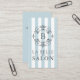 A European inspired business card design in French blue and white awning stripes, this custom business card has a logo-style hand drawn scroll frame surrounding your monogram. Shown here as a hair and nail salon card, it also makes a nice choice for a boutique, spa, skin care, cafe, restaurant, designers, fashion industry, jewelry designer, and other professional businesses. Add or remove lines of text to suit your preferences. There is ample space on the reverse side of the card for including your social media accounts.