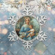 The French Blue Madonna ornament features an image from a beautiful antique French holy card printed at the end of the nineteenth century. Jesus and the Blessed Mother are surrounded by fluttering white doves and a hazy wooded landscape.