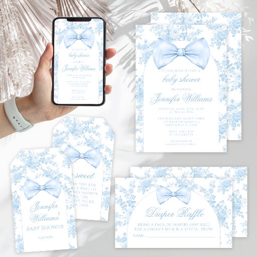 French Blue Toile Bow Tie Boho Baby Boy Shower Invitation