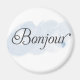 Hello in French - Bonjour in a cursive font with a blue watercolor swoosh underneath.