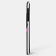 A phone case with a cartoon dog wearing glasses, the dog is black and white with pink ears and pink glasses, the background is black and white stripes.