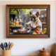 This charming image features a white, black, and brown French Bulldog, donned in a white chef's hat and a white jacket with a stylish brown leather-look apron. With focused determination, the adorable canine uses spatulas to expertly flip two sizzling steaks on an outdoor grill, while an out-of-focus figure works in the background. Fresh vegetables and bottles line the table, completing this delightful, sunlit BBQ scene.