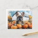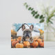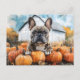 A watercolor-style painting of a French Bulldog sitting among pumpkins in front of a rustic white barn. Autumn trees frame the scene with warm golden tones, creating a cozy seasonal atmosphere.