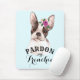 This fun mousepad has a cute brown and white watercolor French Bulldog with a small bouquet of purple, peach, and green watercolor flowers and leaves sitting on her forehead on a pale blue background that can be changed to any color you want. The customizable text says "Pardon my Frenchie".