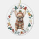 This cute Holiday ornament features a watercolor image of an adorable French Bulldog puppy dressed in his winter sweater and hat. The image is framed within a colorful circle wreath made up of various Holiday images, including a snowman, bells, candy cane, stocking, holly, and more! The back of the ornament has the same wreath image with your custom text in green, gold, and red. See more Frenchie designs at Dog Village.