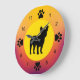 Dog owners and dog lovers will enjoy this colorful design featuring a French Bulldog silhouette and paw prints representing the numbers on the clock face, with a background of sunset colors of oranges, yellows and reds.