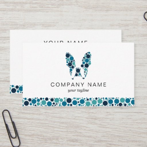 Business card template ideal for dog care, dog walking, dog sitting, pet photographer services. The cute design shows french bulldog with blue circles on the front, with your business name and tagline. The back shows your name and contact information.
