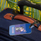 An adorable luggage tags for all cat lovers out there . It has four stripes of different blue shades and a grey and black tabby wearing a beret sending you hugs and kisses . Personalize with a name and it'll be yours .
