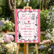 Celebrate the bride-to-be with this French chic, hand-drawn pink stripe bridal shower welcome sign. Featuring whimsical illustrations in contrasting black, modern handwritten script-inspired fonts, girly bows, and sweet hearts with a retro flair, this foam board sign is perfect for a stylish Parisian themed champagne brunch, a romantic wedding shower, or a unique and playful garden party for a soon-to-be-bride. Feel free to reach out if you need any help with customization.
