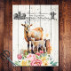 Cute, Alpine goat and her kid behind a pink and yellow floral bouquet. Farmhouse country, vintage, victorian, lettering signage on a worn, white, wooden board background. Perfect for a rustic farmhouse or french country vibe, especially doing decoupage crafts.