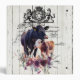 Cute, angus cow and her calf behind a purple floral bouquet. French country, vintage, victorian, lettering signage on a worn, white, wooden board background. Perfect for a rustic farmhouse or french country family cookbook, scrapbook, or photo album.