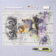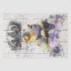 Cute, Cornish Cross hen and her chick behind a light purple floral bouquet. French country, vintage, victorian, lettering signage on a worn, white, wooden board background. Perfect for a rustic farmhouse or french country vibe, especially doing decoupage crafts.