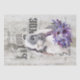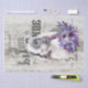 Cute, gray and white bunny with floppy ears behind a purple floral bouquet. French, vintage, victorian, lettering signage on a worn, white, wooden board background. Perfect for a rustic farmhouse vibe or doing decoupage crafts.