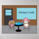 A cute brown dog wearing a striped shirt and a blue beret along with a pink and white poodle dog sit and enjoy a croissant and a macaroon along with some coffee outside a cafe. The text on the door and windows are customizable and can be changed to fit your needs!