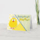 A polka dot chick in bright yellow pairs with soft periwinkle blue in a patchwork style Easter card for children with Joyeuses Pâques on front and a blank inside area where you may write a special message to any French speaking boy or girl.