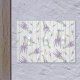 This design features a pattern of drying lavender flower bundles tied with purple and green bows over a rustic white wood background.