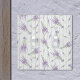 This design features a pattern of drying lavender flower bundles tied with purple and green bows over a rustic white wood background.