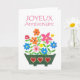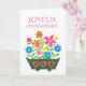 A pretty birthday card with a colourful 'window-box' design, from a handpainted paper collage by Judy Adamson. The French greeting is in pink and the inside is left blank for your own message.