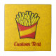 Cartoon illustration of small pack of french fries. Junk food outline icons yellow pattern background. Custom text.
