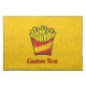 Cartoon illustration of small pack of french fries on yellow seamless junk food pattern background. Custom text.