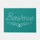 Beautiful and trendy French language home welcome mats with the word welcome expressed in a stylish lettering with floral motif accent graphic and teal colored background color you can change if you prefer another backdrop color. Designed to welcome guests and visitors to your home or business.